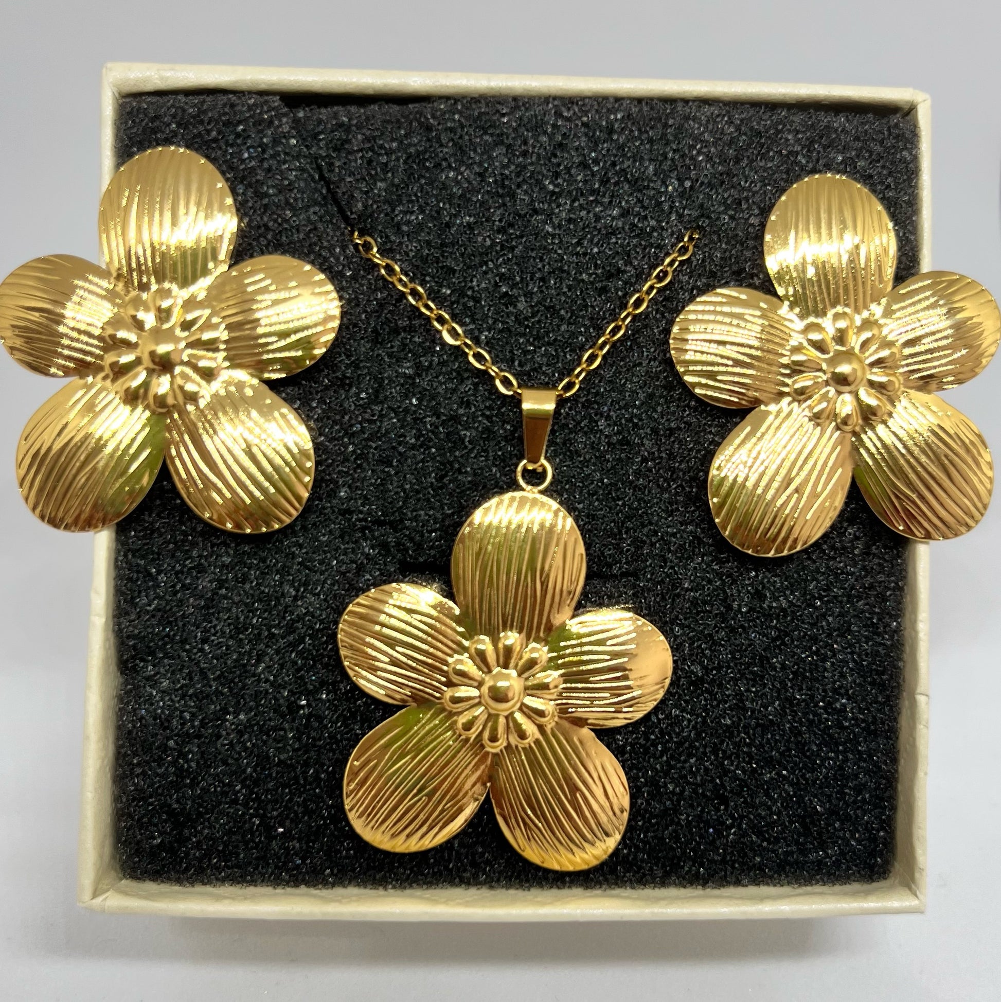 Parrure en fleur en acier inoxydable, alliant élégance intemporelle et durabilité. Cet ensemble coordonné arbore un motif floral raffiné, parfait pour sublimer votre silhouette au quotidien ou lors d'occasions spéciales. L'acier inoxydable garantit une résistance exceptionnelle à la corrosion et à l'usure, préservant l'éclat de vos bijoux au fil du temps. Pièces harmonieuses qui se complètent pour un style cohérent et sophistiqué.