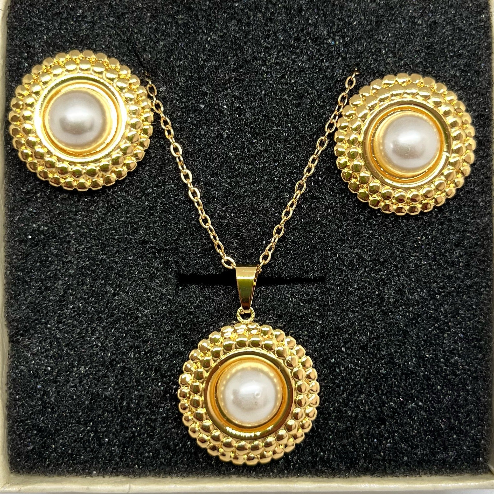 Parrure Perla : ensemble de bijoux en acier inoxydable alliant élégance et durabilité. Chaque pièce arbore un design circulaire épuré, sublimé par une perle centrale qui capte la lumière avec raffinement. L'acier inoxydable garantit une résistance exceptionnelle à la corrosion et à l'usure quotidienne, préservant l'éclat de votre parure au fil du temps. Idéale pour les occasions spéciales comme pour un port quotidien, cette collection incarne la sophistication intemporelle. Un choix judicieux pour celles qui recherchent des bijoux fiables et esthétiquement remarquables.